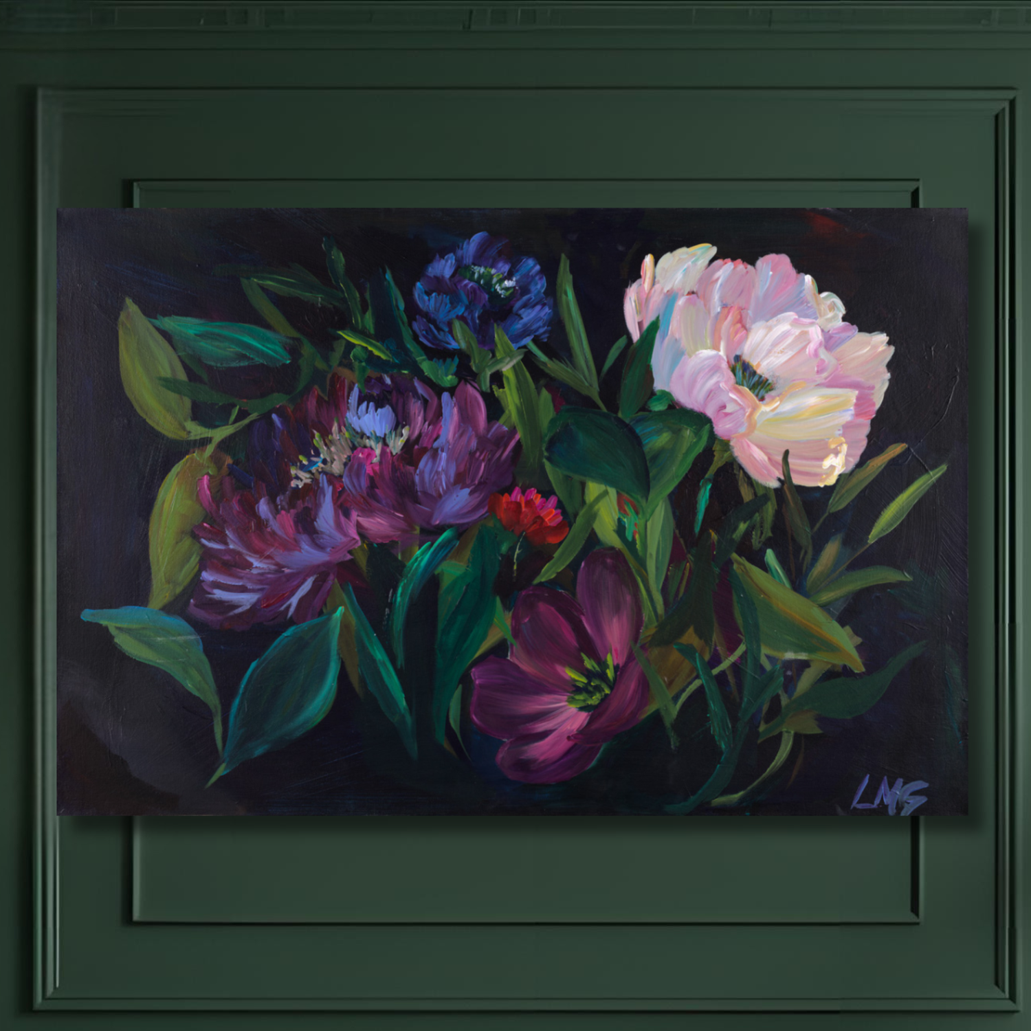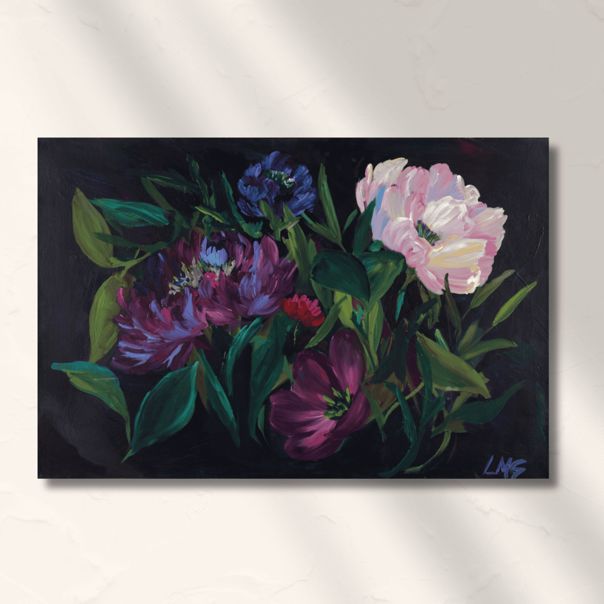 Moody blooms came from a place a growth. Pushing myself to learn more, go outside of my comfort zone. I feel most comfortable filling the canvas with color. I wanted to create a floral piece of art where you could feel calm and joy. Creating breathing room for the bold purples to to take up space without overwhelming. My mind tends to be very busy and many of my paintings are very busy.